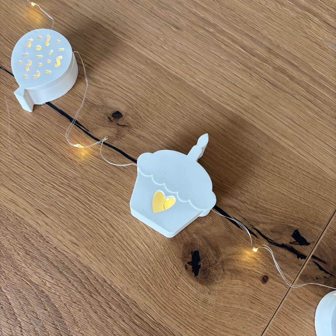 Die Form besteht aus einem Cupcake-Motiv mit passendem Cover und Rückseite – alles in einer Form vereint. Du kannst die Teile entweder als Lichterketten-Element nutzen oder auch einzeln dekorativ einsetzen und deiner Kreativität freien Lauf lassen.